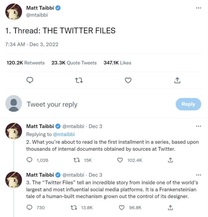 这份被称为“推特档案”的内部通讯记录,由美国作家马特·泰比(Matt Taibbi)在其推特账号发布,来源于他从推特那里获得的“数千份内部文件”。