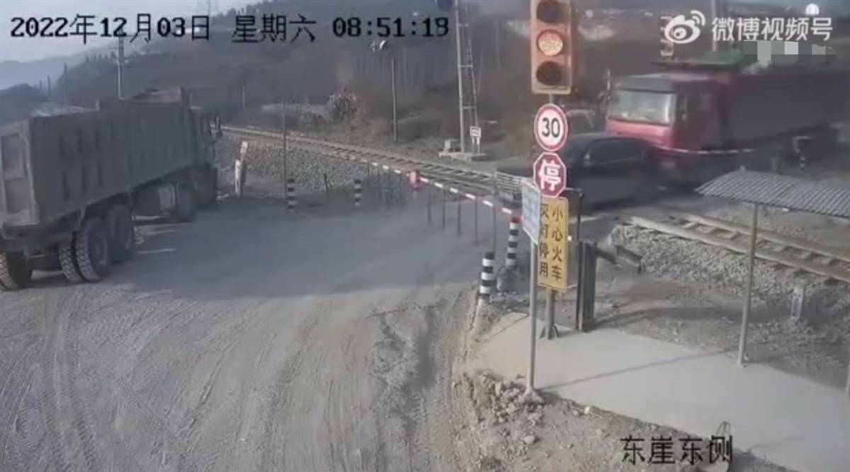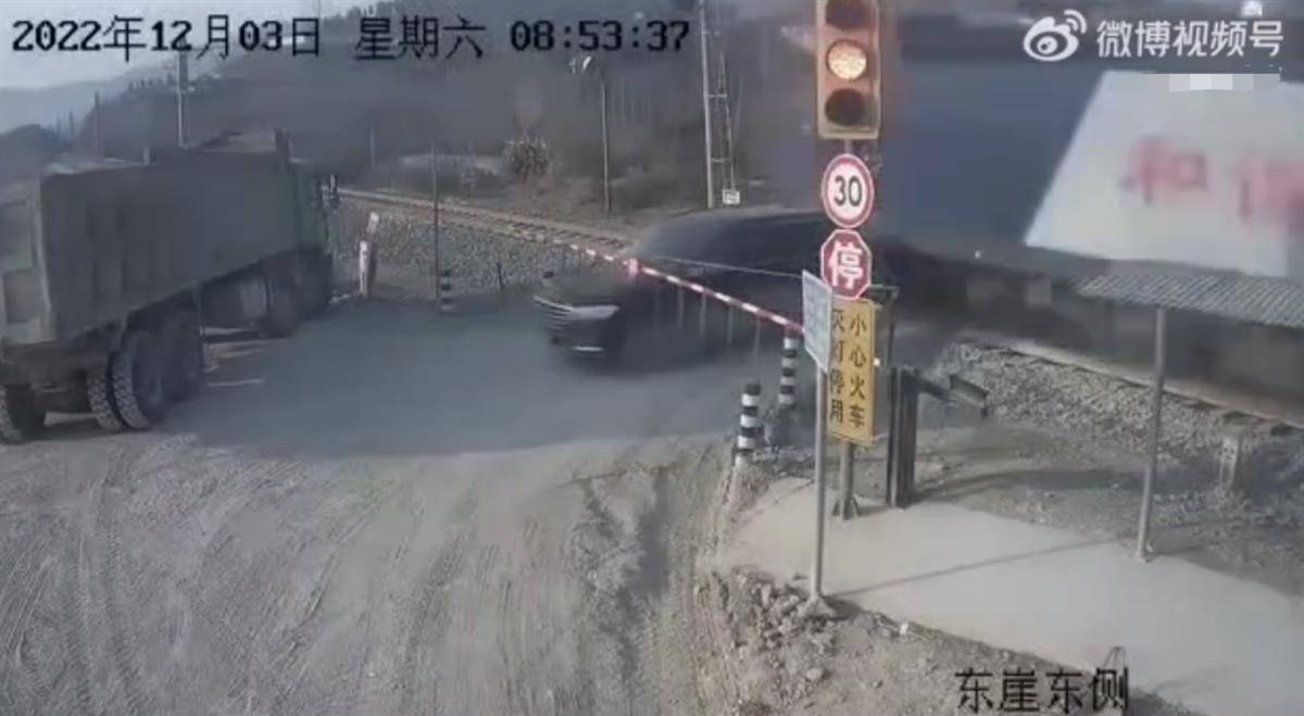 网传视频显示,监控时间12月3日上午8时50分许,一辆黑色suv停在铁路道闸外等待,后方一辆大货车突然开始缓慢前进,黑色suv一点点被大车推到了铁路轨道上。随后,大货车快速向后倒车,suv上的人员下车查看,并拨打电话。在接下来的1分半时间内,suv一直停在铁路上。8时53分20秒许,视频中传来火车的鸣笛声,suv上的人员急忙上车,在驾车驶离轨道仅仅1秒后,火车与小车“擦肩而过”,十分惊险。最后,火车也逐渐减速停了下来。