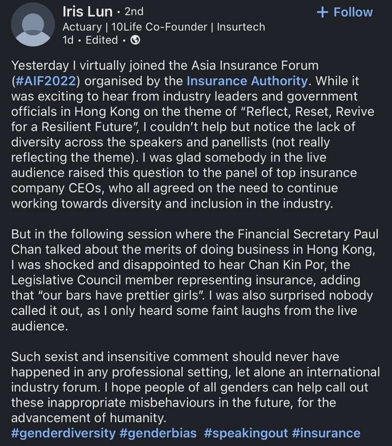 资深精算师、10Life联合创办人伦凯恩(Iris Lun)在Linkedin控诉,日前她在在线参加亚洲保险论坛,香港财政司司长陈茂波谈在香港经商的好处时,她听到陈健波指“香港酒吧靓女多”,令她感到震惊和失望,同时也很惊讶没有人表示不满,亦隐约听到现场观众的笑声。