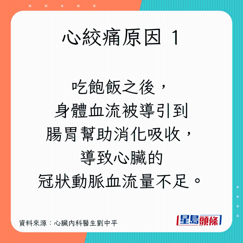 刘医生指出,若确定肠胃没问题,吃饱饭之后感到胸痛时,就要留意一件事:是否由严重的冠状动脉狭窄所引起的心绞痛。他引述研究指,饭后心绞痛患者,较易出现主干或多条的冠状动脉病变,亦经常会在休息期间感到心绞痛。原因有以下3个: