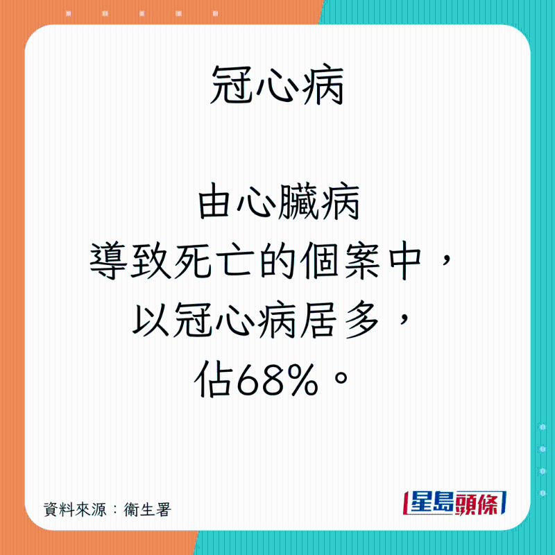 香港卫生署指,心脏病为香港常见的致命疾病,尤以冠心病最多,详情如下:
