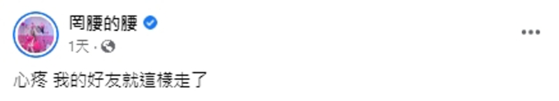 对此,罔腰在昨(8)日在脸书上转发相关新闻,哀痛表示,“心疼,我的好友就这样走了。”对于友人的离世,感到十分不舍。