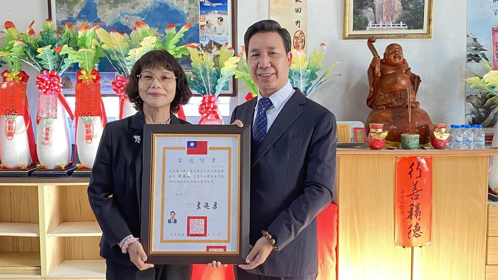 ▲“中选会”委员陈月端(左)今日上午飞抵金门到县长当选人陈福海服务处颁发第8届县长当选证书。中时网