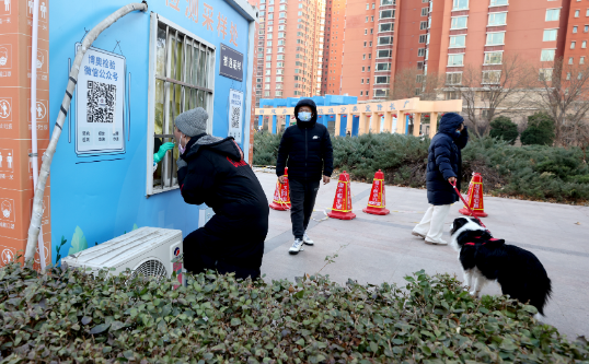 ▲北京市丰台区一处核酸检测点,市民接受检测。中新社