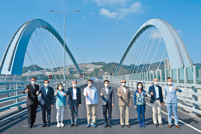 ▲李家超(左六)与一众嘉宾出席将军澳—蓝田隧道及将军澳跨湾连接路通车仪式。