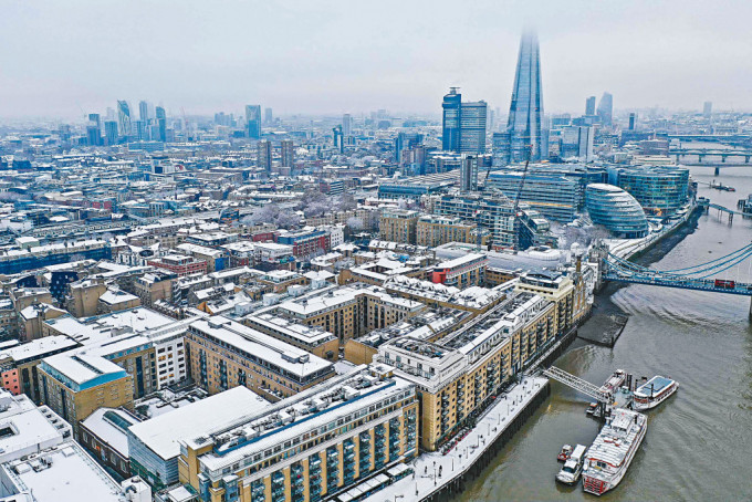 ▲伦敦迎来寒流,泰晤士河南岸的建筑物被白雪覆盖。