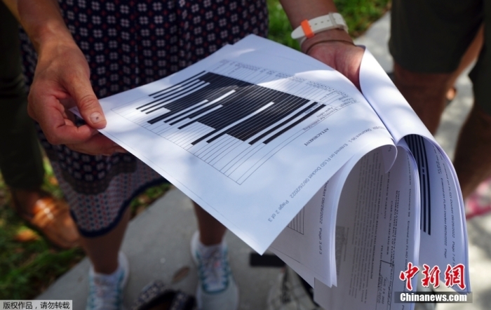 ▲美国司法部8月26日公布联邦调查局(FBI)申请搜查海湖庄园时向法院提交书面证词的部分内容。为确保不影响仍在进行的调查以及人员安全,这份文件有多页被几乎完全涂黑。