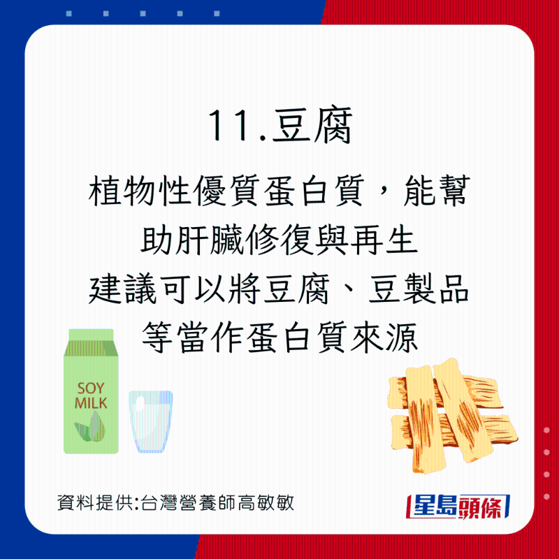 营养师高敏敏续指,除了上述养肝食物,也可多吃原型食材; 减少吃加工品、油炸等高热量食物; 尽量避免甜食,因为糖分会使脂肪堆积于肝脏。