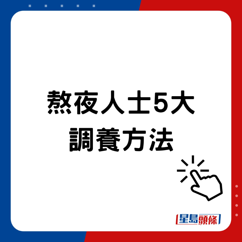 香港注册中医师吕兆升曾指出,长时间熬夜,长远下去,会对身体带来许多坏影响。 他建议熬夜人士用以下方法调理: