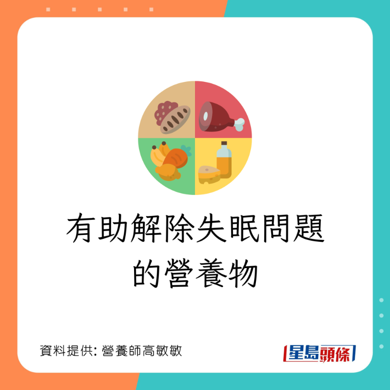 营养师高敏敏曾在社交媒体发文,指改善失眠问题可从饮食方面入手,摄取有助改善睡眠的3大营养素。她解释营养素的作用,并列举多个食物例子,常发恶梦或失眠人士不妨试试。