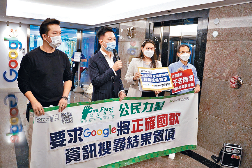 港队出战国际赛事,屡次出现主办方错将“港独”歌充当国歌播放。港府早前要求搜寻器Google,将正确的香港国歌信息置顶被拒。香港行政长官李家超表示,知道技术上Google是完全可以做得到,重申任何国家的国歌都代表其国家民族尊严及感情,将继续去信与Google交涉。本身是资深大律师的行政会议成员汤家骅认为,政府已经向Google解释相关歌曲是宣扬“港独”的歌曲,如果Google继续坚持现时做法,有可能干犯《香港国安法》的协助分裂国家罪。