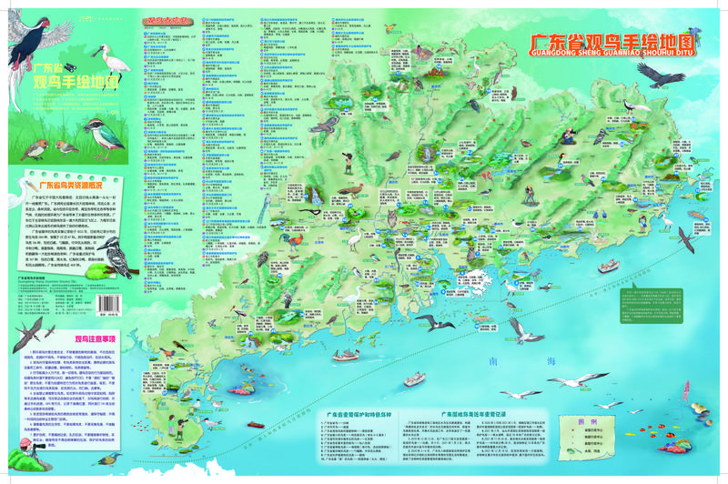 观鸟、拍鸟有了“向导”!近日,一份以记录和推荐广东最佳观鸟点和典型生境特色的《广东省观鸟手绘地图》正式发布。该地图是广东首份以观鸟为主题的手绘地图,观鸟点涵盖了广东21个地级市的森林、湿地、湖泊、城市、乡村等多样的地理和生境类型,集中展示了广州南沙湿地、南岭国家级自然保护区、海丰鸟类省级自然保护区、湛江红树林国家级自然保护区等50个观鸟点的野生鸟类分布情况,用图文并茂的形式为观众提供了一份观鸟指南。