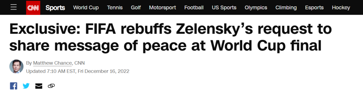 ▲国际足联拒绝泽连斯基在世界杯决赛上分享和平信息的请求。