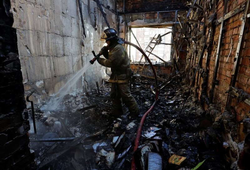 ▲乌克兰官员表示,俄罗斯于16日早晨尖峰时段对乌国发射逾70枚导弹,为开战以来最猛烈攻击之一。图为顿涅茨克消防员15日在遭俄罗斯炮击的建筑物内工作。Reuters
