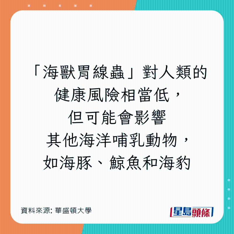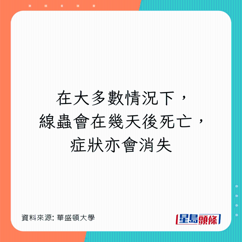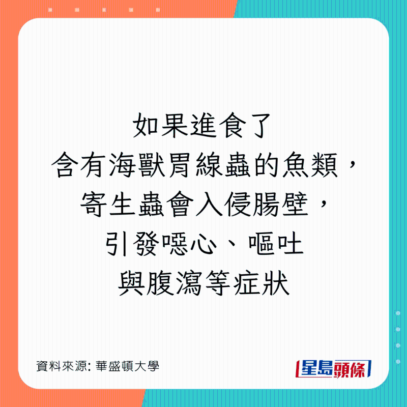 吴医生续指,患者体内的寄生虫应该是海兽胃线虫(Anisakiasis)或日本血吸虫(Schistosoma japonicum),由于当时医院并无杀虫药,所以要转介患者至其他医院的感染科接受治疗。 吴医生最后提醒,进食前一定要先把食材彻底煮熟,才能避免吃下寄生虫。