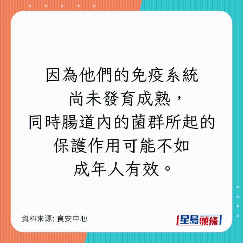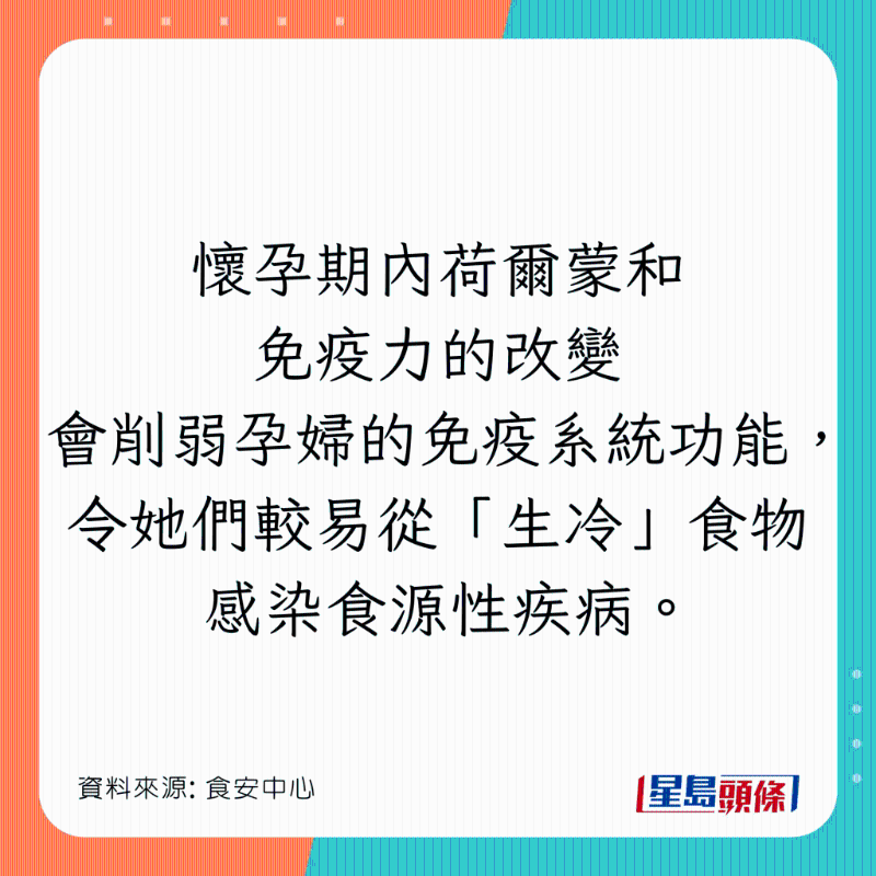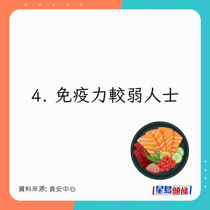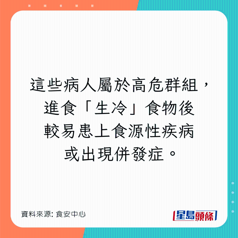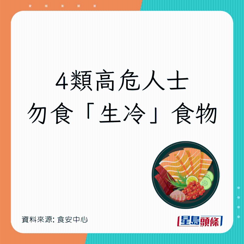 根据食安中心网站资料,进食生冷食物会增加感染食源性病原体的风险,当中有4类高危人士有可能出现严重症状,甚至会有生命危险: