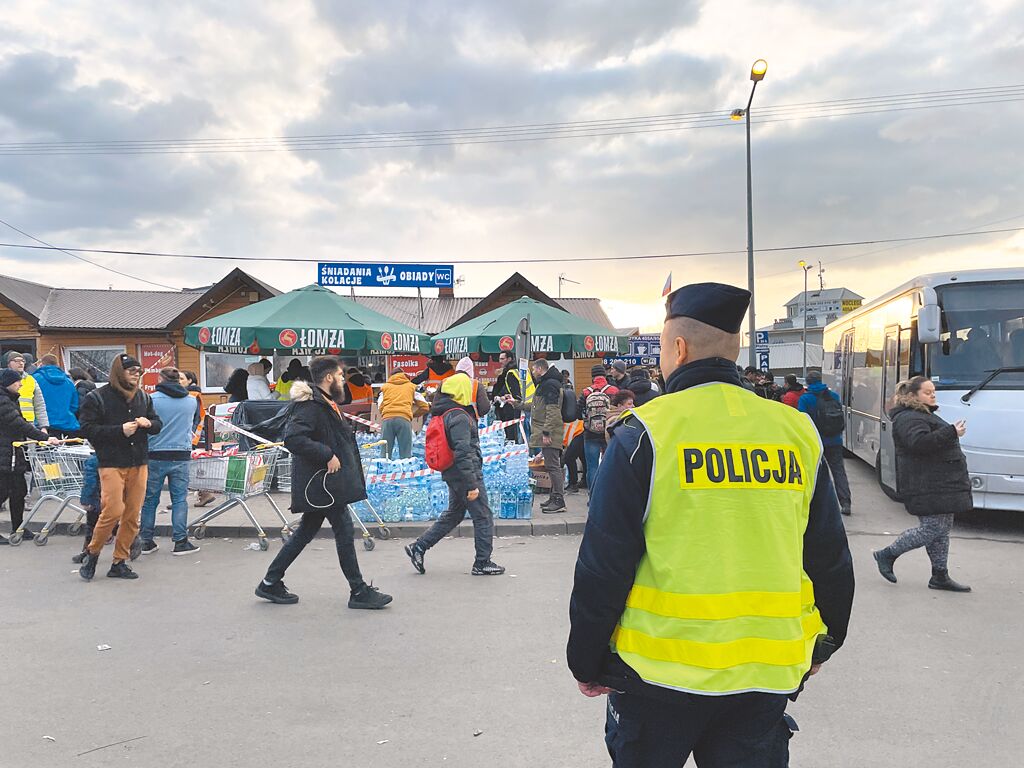 ▲波兰警察首长15日拆礼物时遭炸伤,他指出,爆炸导致他受轻伤住院的乌克兰礼物包裹内,装的是反坦克榴弹发射器。图为警察在波兰边境口岸梅迪卡维持秩序。新华社