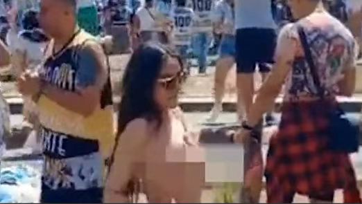 据《每日邮报》(Daily Mail Online)报导,这段画面近日在推特被疯传,这名带着墨镜的黑发女子极为神秘,3点全露在挤满人的街道上展现身材,地点就位于该市最具代表性的地标“方尖碑”(Obelisco )附近。可以看到女子光着身体,高举双臂、扭腰摆臀跟着庆祝,似乎毫不在意周围还有带着小孩的家庭,目击者也被她诡异行径吸引,看得目不转睛。