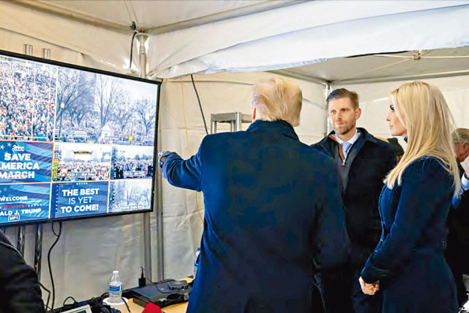 ▲调查报告发布的这张图片显示去年1月6日,特朗普透过闭路电视观看白宫草坪上的人群。