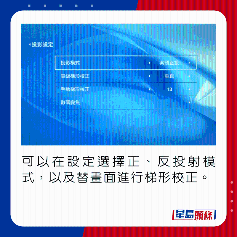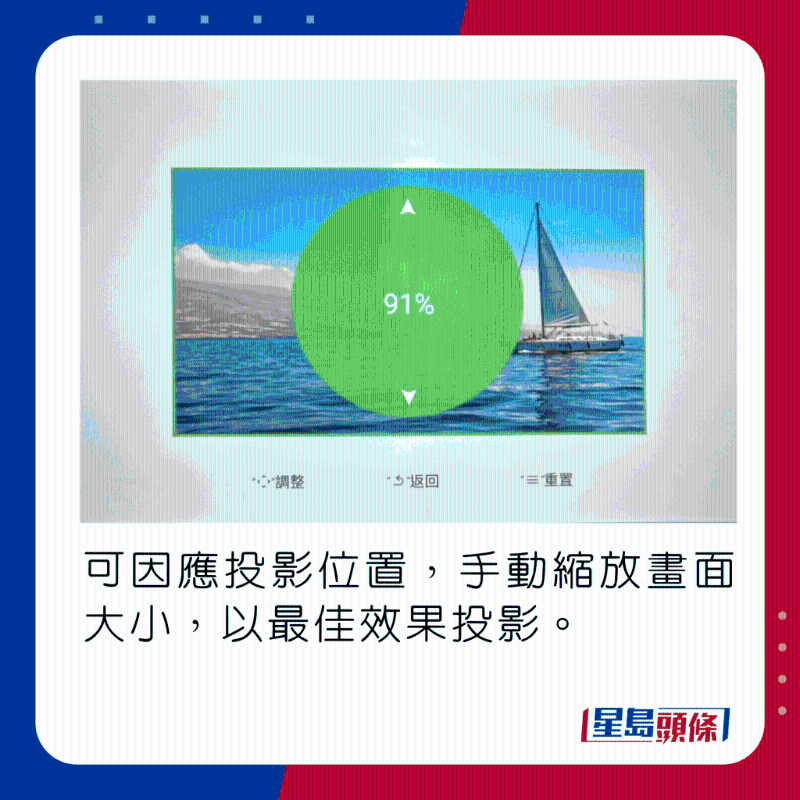 当以无线方式连接家中的2.4GHz或5GHz WiFi网络,M1 Pro即可串流播放影片,实试播放YouTube影片,可以选择最高1,080p解像度,画面清晰度及格,色彩也丰富,而且内置喇叭音量十足,中、低音效果理想,实在不看戏的时间,也可把M1 Pro充当蓝牙喇叭播歌。值得一提的是,除了利用镜头上方的对焦掣手动调校画面清晰度,亦可进入设定进行一系列梯形画面校正,以及将画面放大缩小。若然想投射角度更灵活,M1 Pro机底设有一个1/4吋螺丝孔,用家可以直接装上相机用的小型三脚架,这样便能将画面调高调低,甚至把投影机吊到天花板。