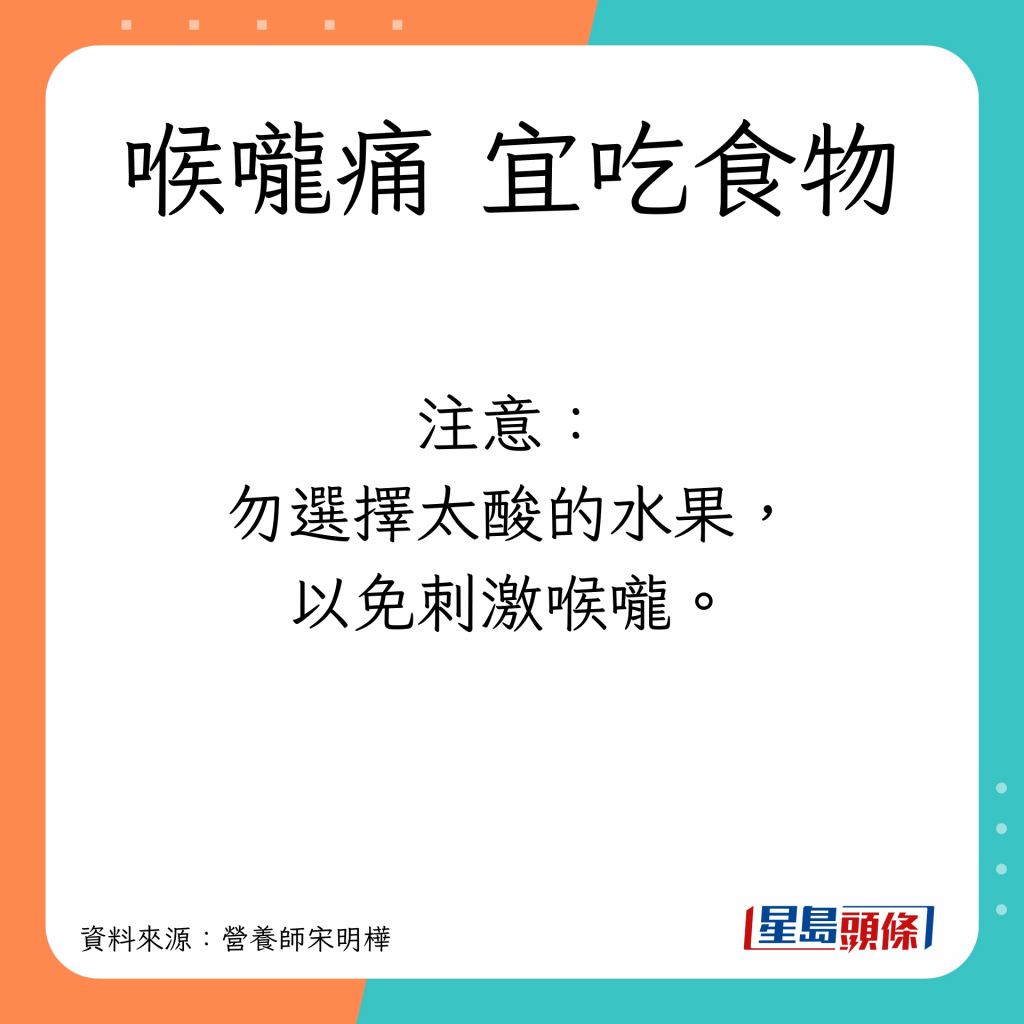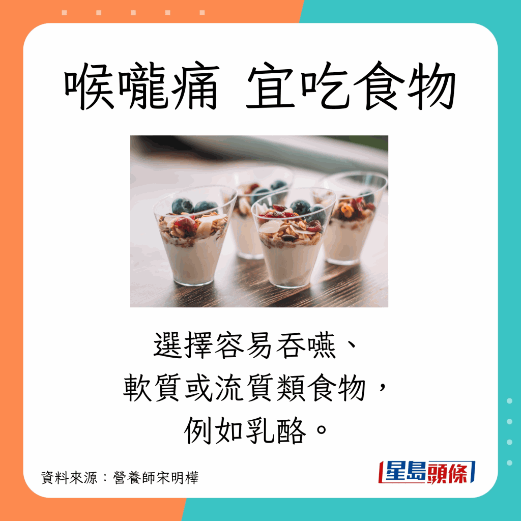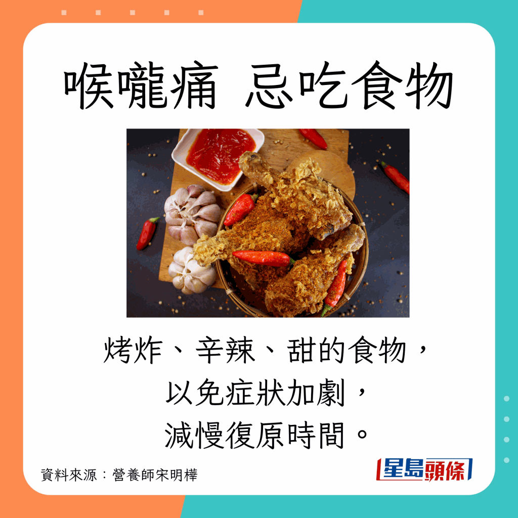营养师宋明桦指,喉咙痛时要避免3类食物,以免症状加剧,减慢复原时间。另她建议吃2类食物,以补充热量,加快复原。