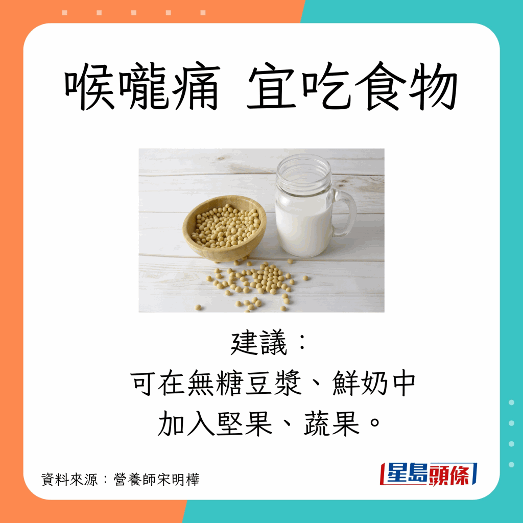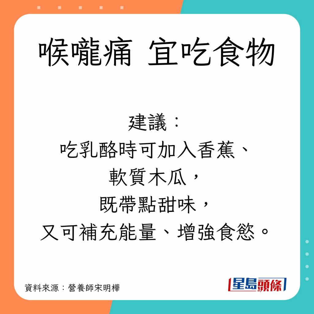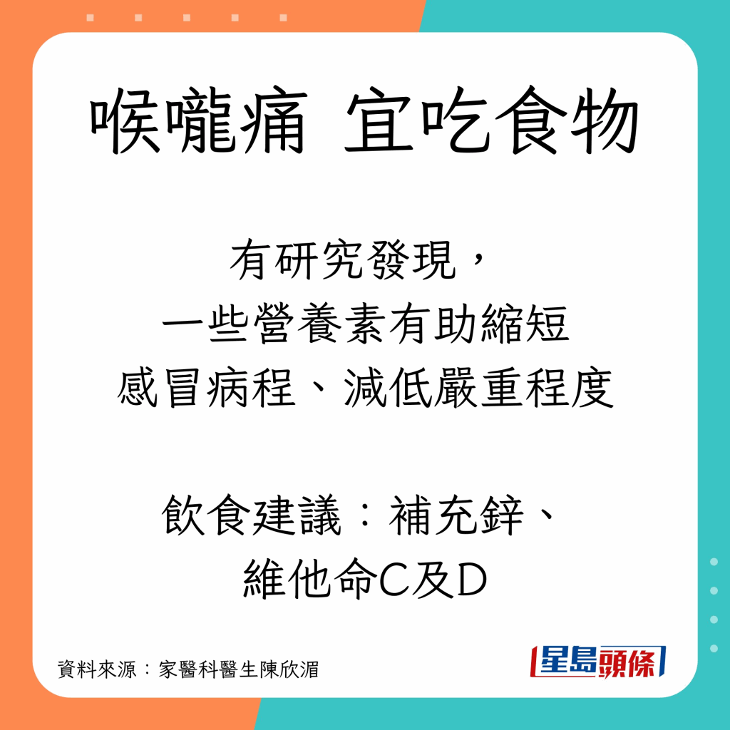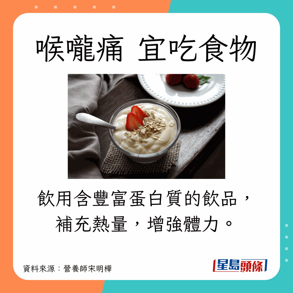 营养师宋明桦指,喉咙痛时要避免3类食物,以免症状加剧,减慢复原时间。另她建议吃2类食物,以补充热量,加快复原。
