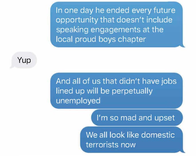 ▲希克斯在2021年1月6日给拉德福德的短信中写道,“在一天之内,他结束了所有未来的机会……我们所有没有找到工作的人都将永远失业。我很生气,很难过。我们现在看起来都像是国内的恐怖分子。”