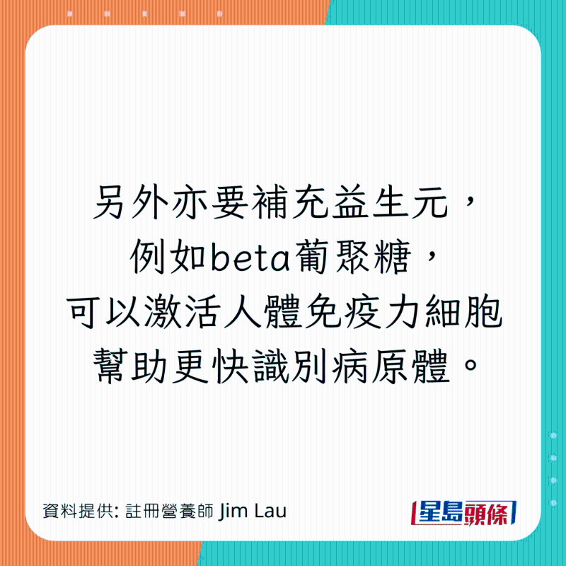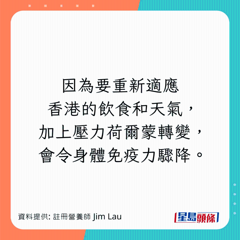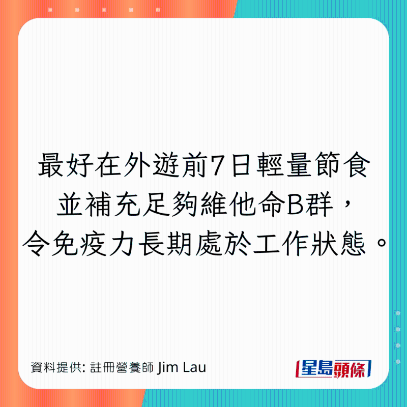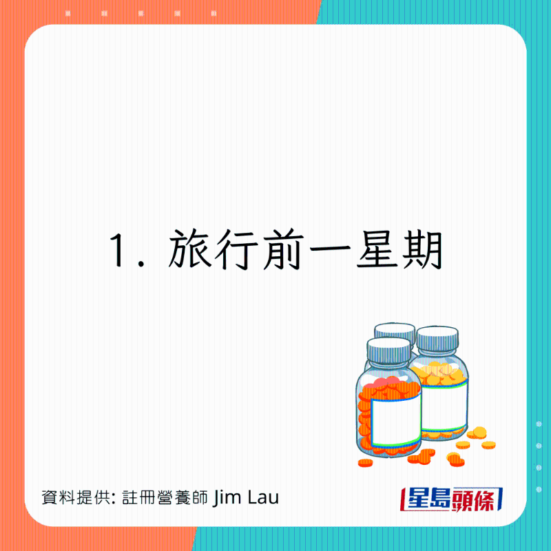 注册营养师Jim Lau早前在社交媒体上表示,要避免旅行时染病,建议分3个阶段提升免疫力: