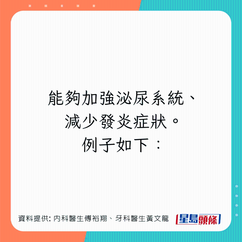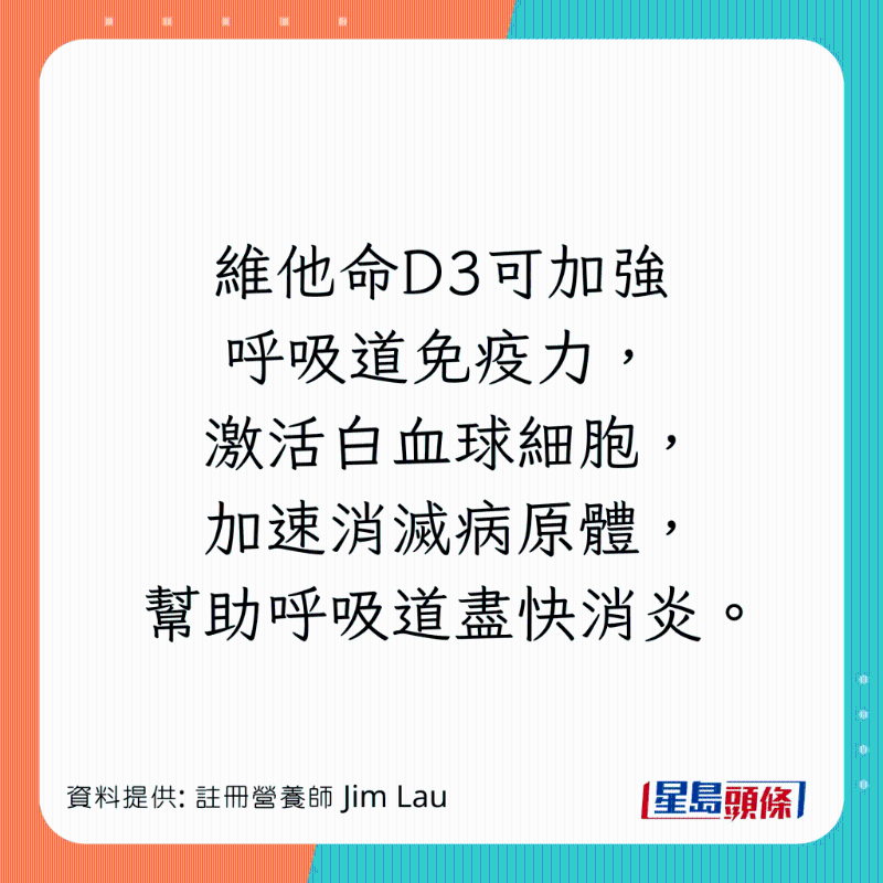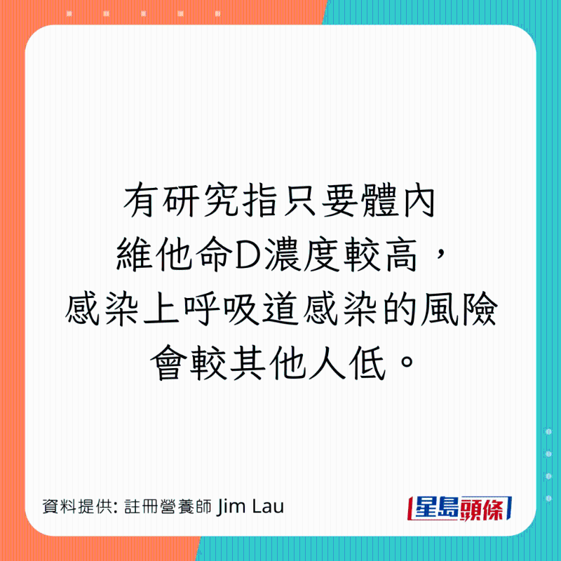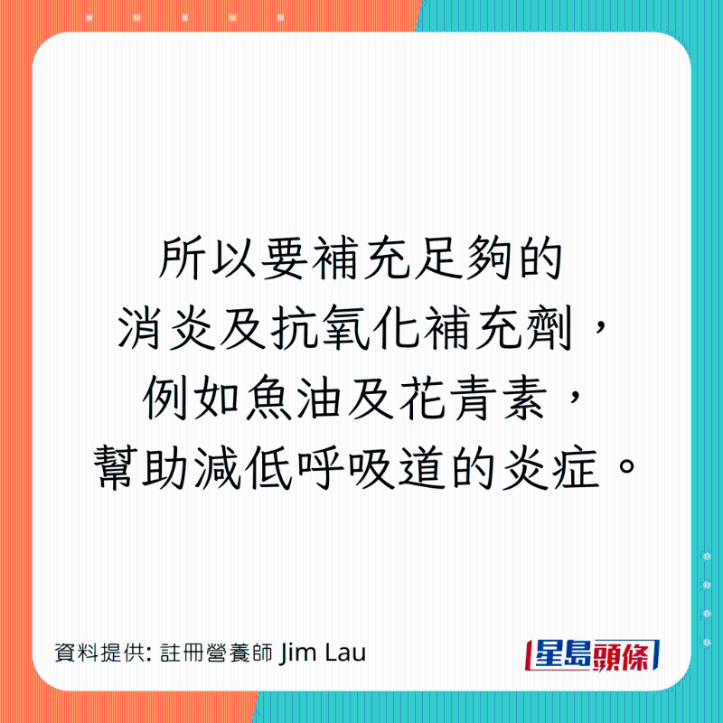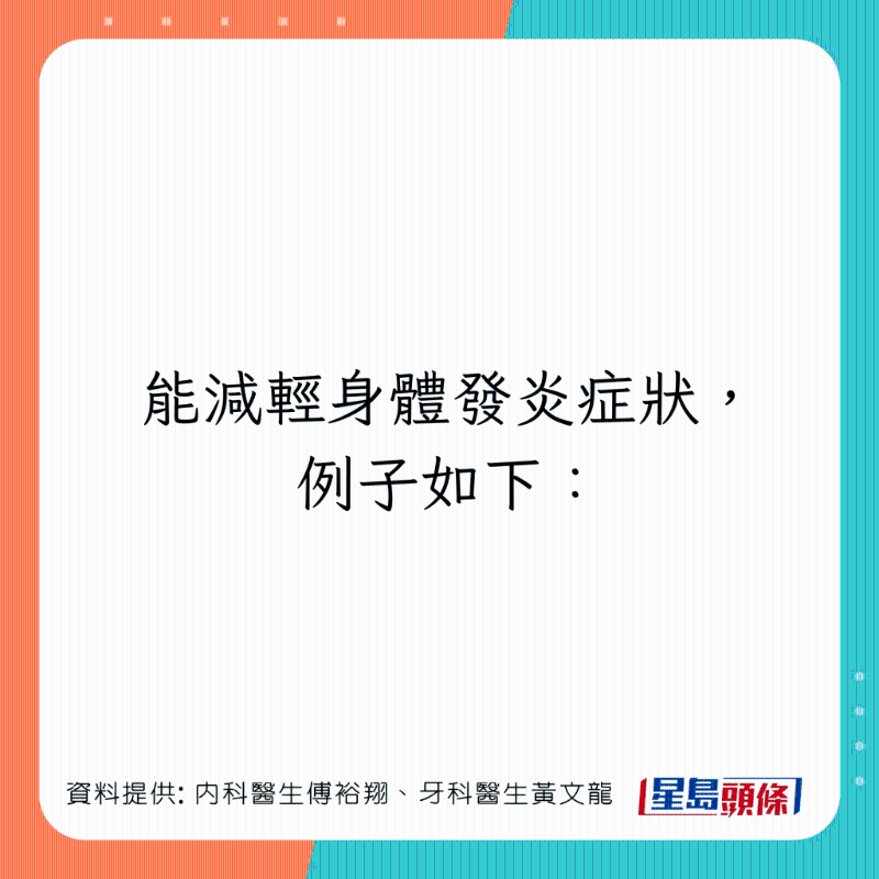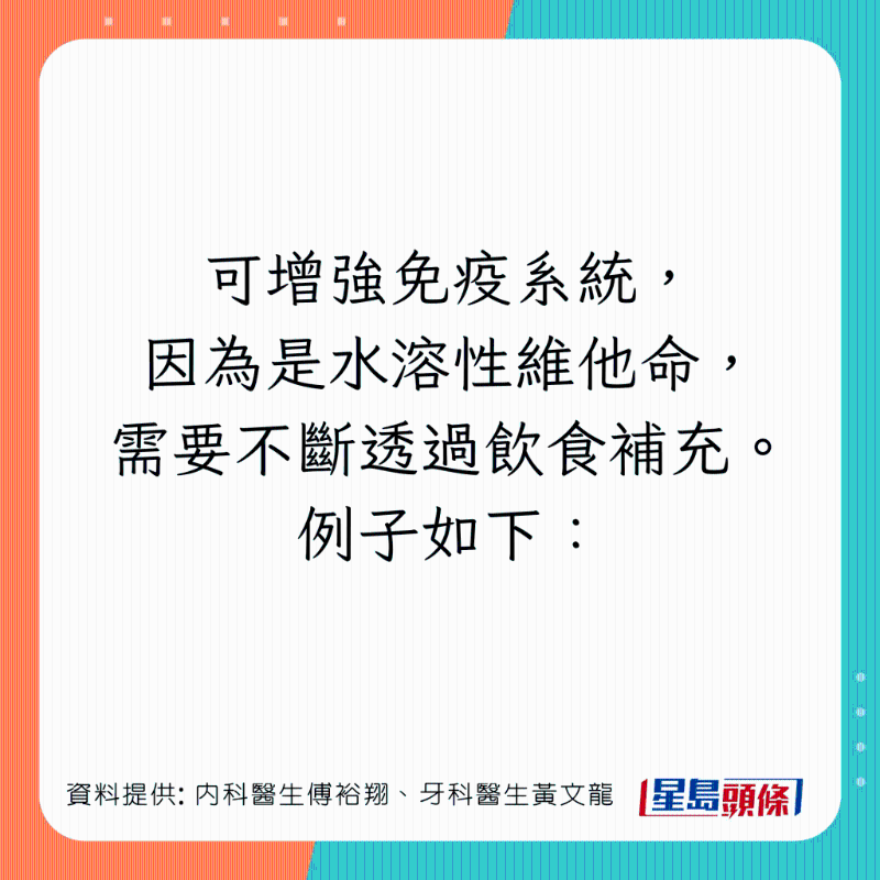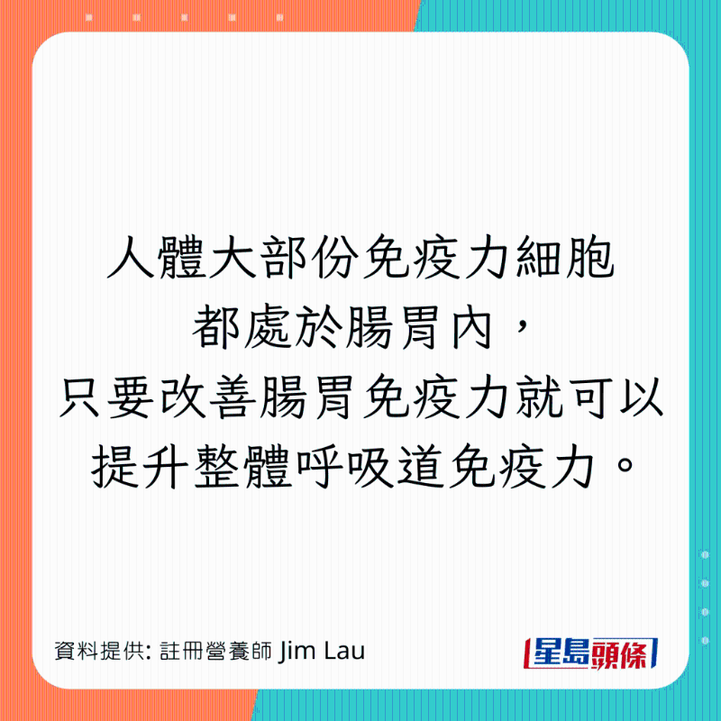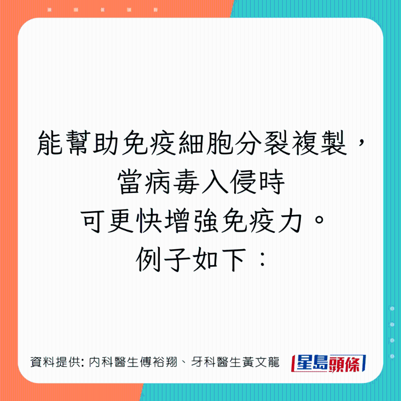 台湾内科医生傅裕翔及牙科医生黄文龙曾在社交媒体上发文表示,冬季为流感高峰季节,市民可从饮食入手增强自身免疫力,并又列出5类有助增强免疫力及抗发炎的食物: