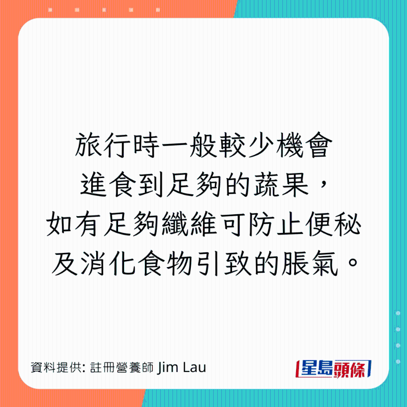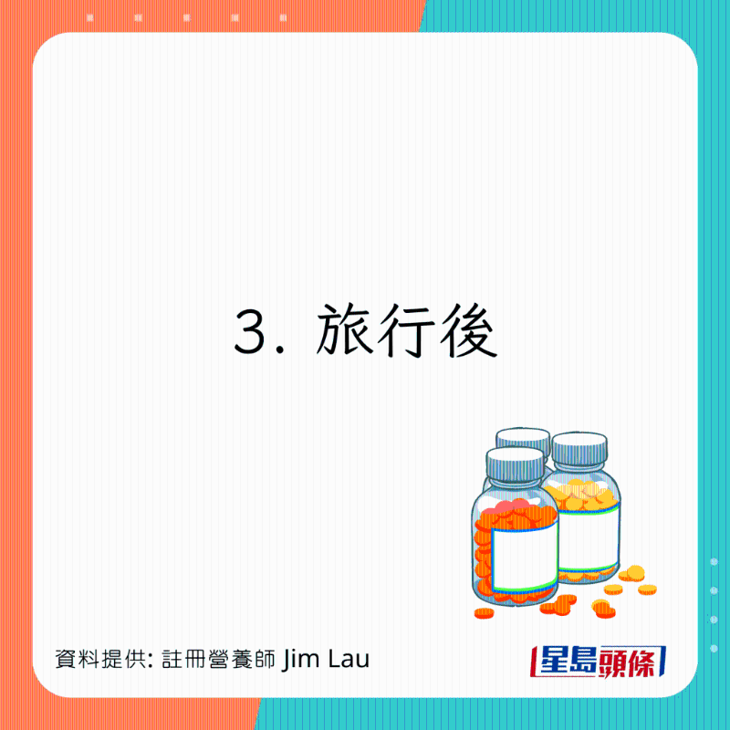 通关在即,去旅行担心染新冠肺炎、腹泻呕吐,要吃什么打底增强免疫力? 香港注册营养师Jim Lau指出,想避免中招感染新冠、水土不服,建议分3阶段摄取营养补充品,包括旅行前后及旅行期间,以提升抵抗力,减低患病风险。