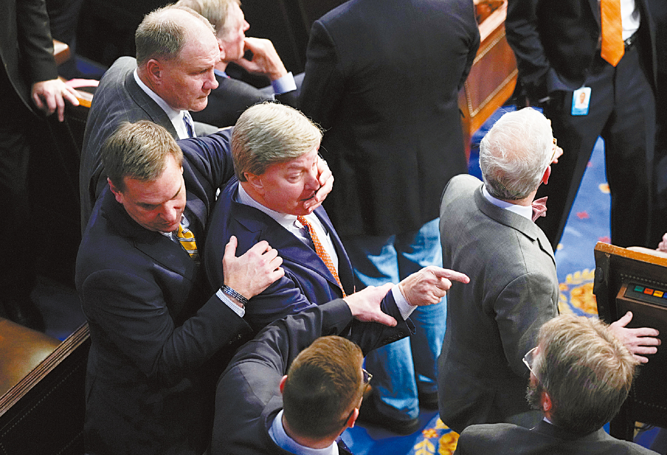 麦卡锡7日凌晨成功当选第118届国会众议院议长,但过程非常艰难曲折。 他6日向极右保守派作出一连串让步之后,对当选议长显得信心满满,但到第14轮投票时,反对派顽固分子之一的盖茨(Matt Gaetz)故意等到最后一个投票,当时麦卡锡仅差一票就可以结束这次漫长战役,岂料盖茨只投了“出席票”,阿拉巴马州议员罗杰斯(Mike Rogers)愤怒地冲向盖茨,几乎酿成打斗,幸而有党友从后拦住,把罗杰斯拉开。