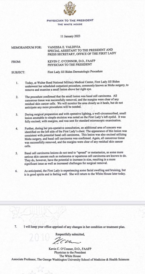 白宫上周指出,吉尔是在皮肤癌的例行检查中发现右眼上方皮肤有病灶。