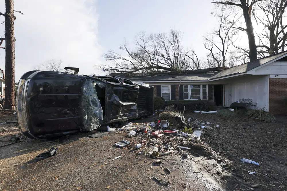 ▲阿拉巴马州塞尔玛,在一所小学附近受龙卷风吹袭后,车辆被吹倒,碎片散落。AP
