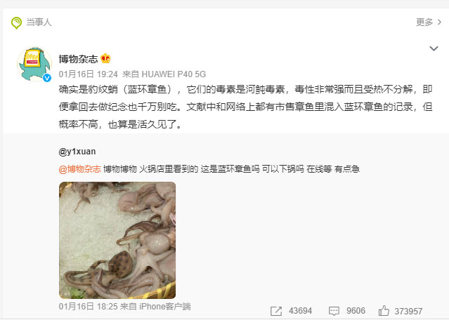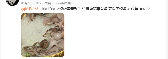 据媒报道,有网民1月16日向官方科学杂志(@博物杂志)留言问及,在火锅店菜品里看到一只疑为“蓝环章鱼”的动物,“问能否下锅?”,@博物杂志官方微博回复称,指生物确为豹纹蛸(蓝环章鱼)。据悉,蓝环章鱼会用河豚毒素麻痹猎物,在海洋中属于剧毒生物之一,被这种小章鱼咬上一口能致命。但这种章鱼不会主动攻击人类,除非它们受到很大的威胁。