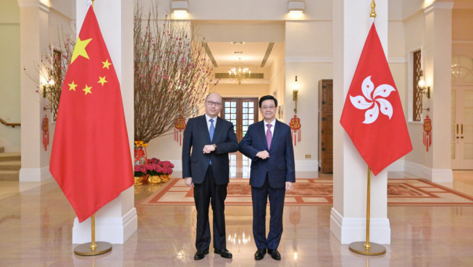 ▲特首李家超(右)中联办主任郑雁雄(左)会面。(政府新闻处)