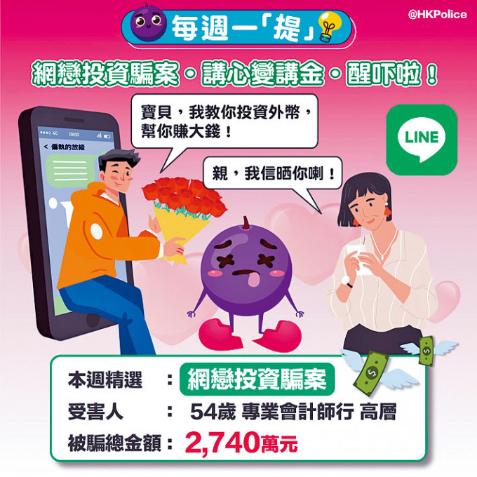 网上情缘及投资骗案连专业人士亦中招!一名女会计师去年于网上认识骗徒,后来成为“网络情人”,骗徒诱使受害人建立投资外币账户,先后按骗徒指示,转账2700万港元至骗徒指定户口,其后受害人发觉被骗报案。另一女护士亦被网友诱使投资加密货币,结果被骗去230多万元。