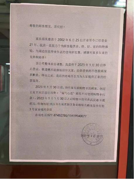 据店铺公告,持有长沙店购物卡的顾客可于1月30日前前往家乐福芙蓉广场店办理退卡,1月30日后退卡事宜则由家乐福武汉光谷店办理。