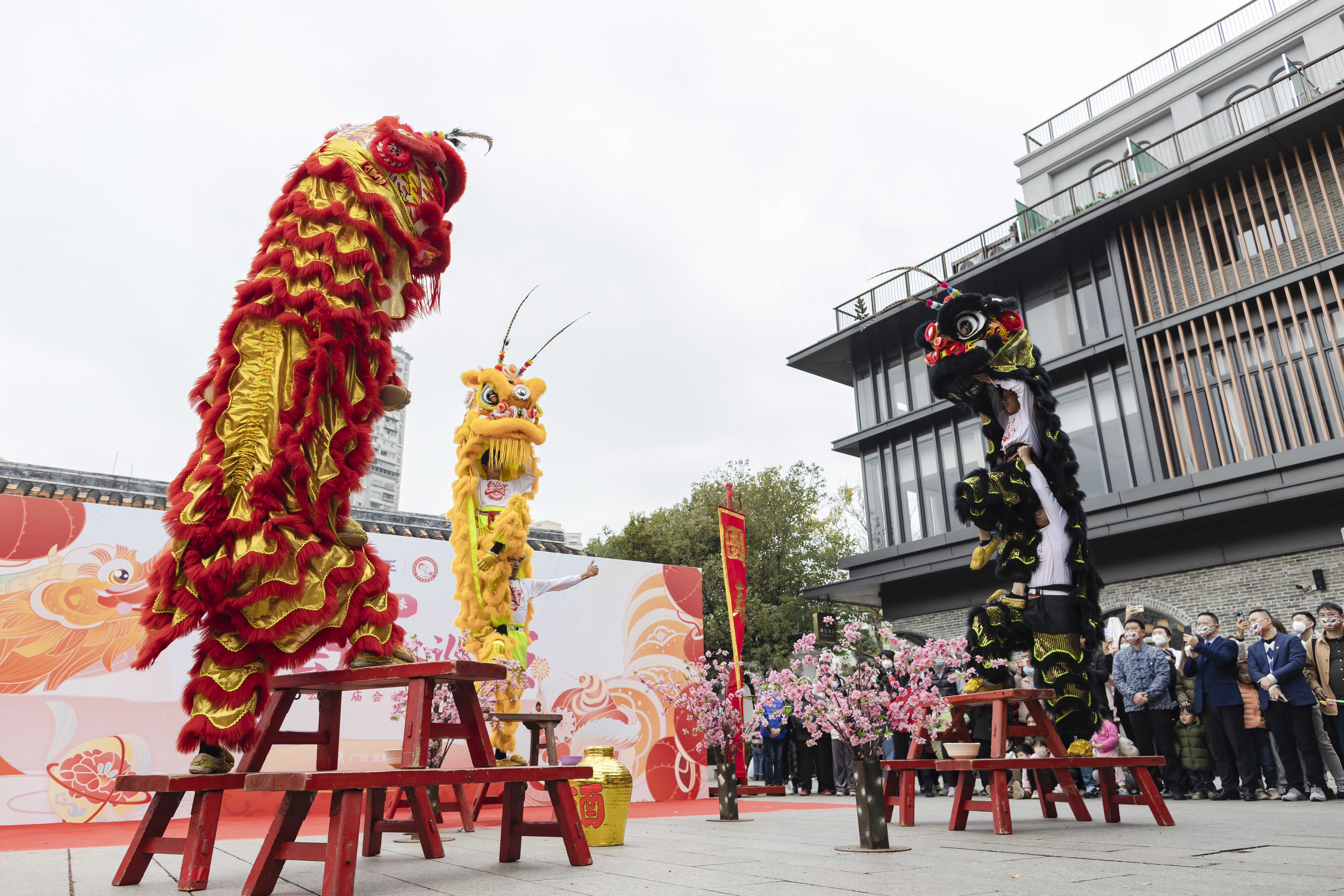2023年春节前,永庆坊旌旗招展,锣鼓喧天,醒狮出动,街坊里三层、外三层将粤剧艺术博物馆广场围得水泄不通,齐刷刷拿出手机,见证广东醒狮赵家班高桩表演“雄狮翻山越岭采青”的经典套路。