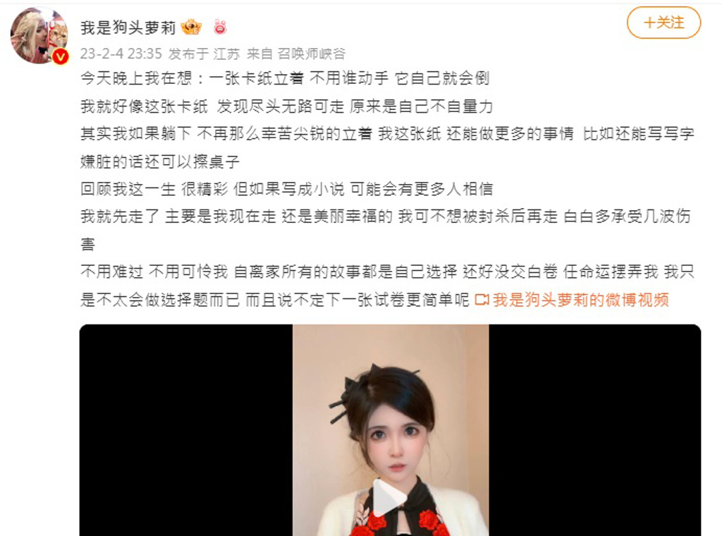 内地网红Coser兼直播主“狗头萝莉”,2021年与男友分手遭对方报复,前男友将她的性爱影片外流,事后前男友因此坐牢,不过她也遭到直播平台求偿600万人民币,之后她透露被父亲猥亵的悲惨往事,近日因参加漫展被驱离,狗头萝莉发表想轻生言论,最后被朋友在荒废的建筑物中找到,警方表示目前人平安。