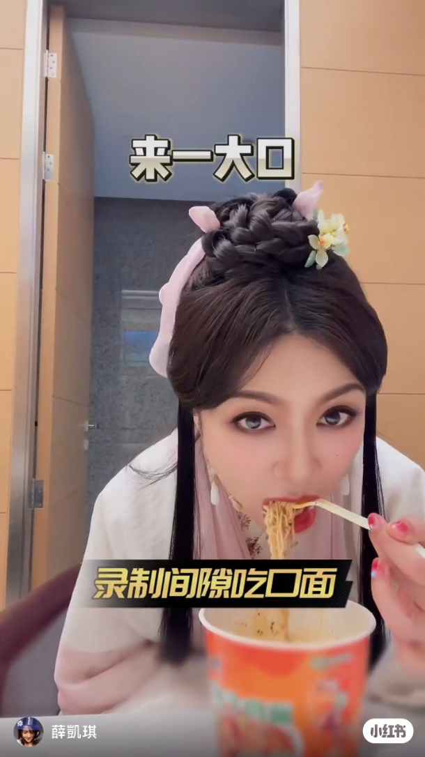 片段中见到身穿古装、扎起头发的薛凯琪,化上烟熏眼妆及嘴唇揸上鲜红色,十足娃娃一样。她在休息室等开工期间,拿住一碗方便面对住镜头大口吸入,又拿起喝汤,被喂饱的表情好满足。但网民质疑薛凯琪并无真吃,只是扮将面条放入口,然后以剪辑代替,故引来网民质疑为拍视频而假吃,疑想营造吃宵夜都不会发胖、天生丽质的假象。不过有粉丝力撑偶像,认为女星为保身形,偶尔吃一点点很正常,又不是拍摄吃播,没必要为拍片扮吃面。