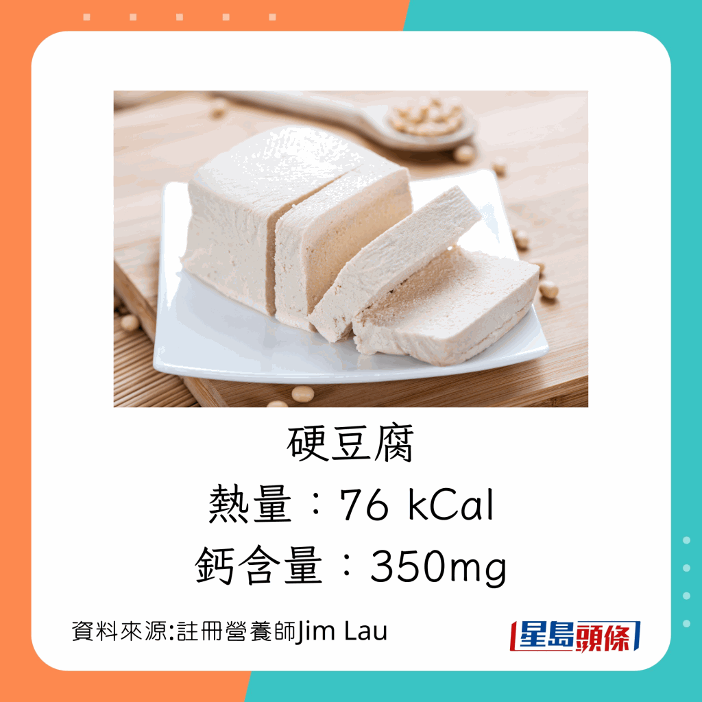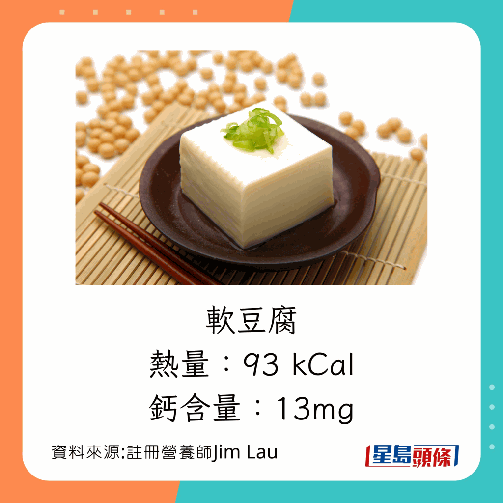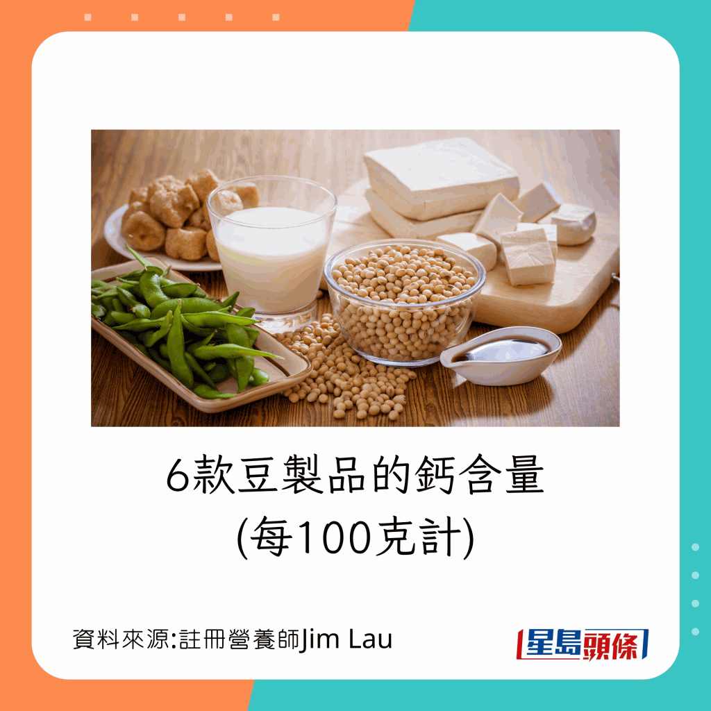 注册营养师Jim Lau指,并非全部豆制品也很高钙,形容各种豆制品的钙含量是差天共地。他列出6款豆制品的钙含量和热量,包括硬豆腐、木锦豆腐、软豆腐、豆浆、百页豆腐、豆干,补钙人士可参考: