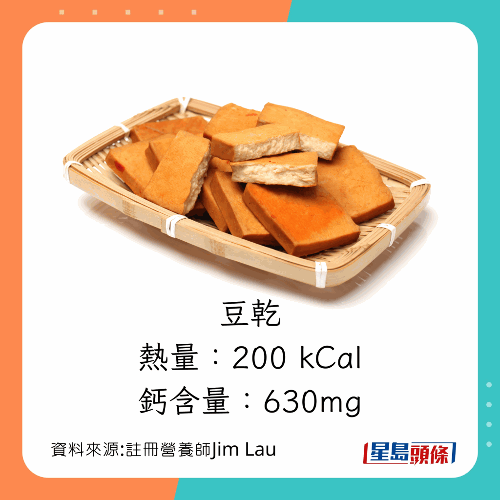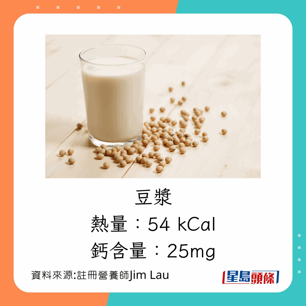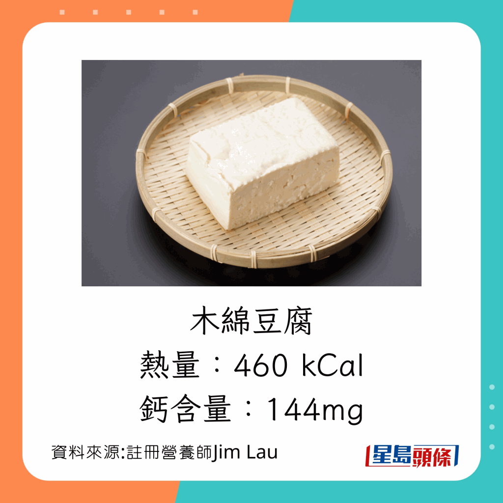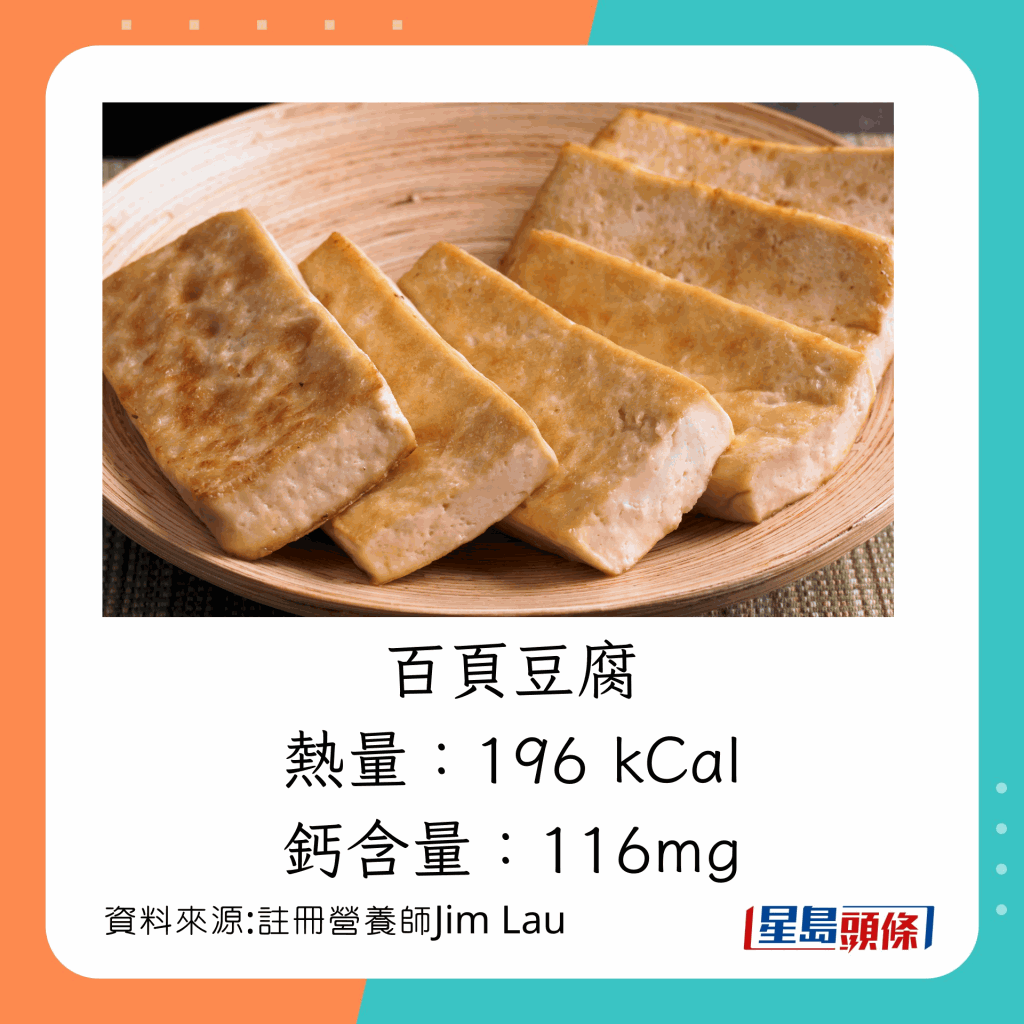 注册营养师Jim Lau指,并非全部豆制品也很高钙,形容各种豆制品的钙含量是差天共地。他列出6款豆制品的钙含量和热量,包括硬豆腐、木锦豆腐、软豆腐、豆浆、百页豆腐、豆干,补钙人士可参考: