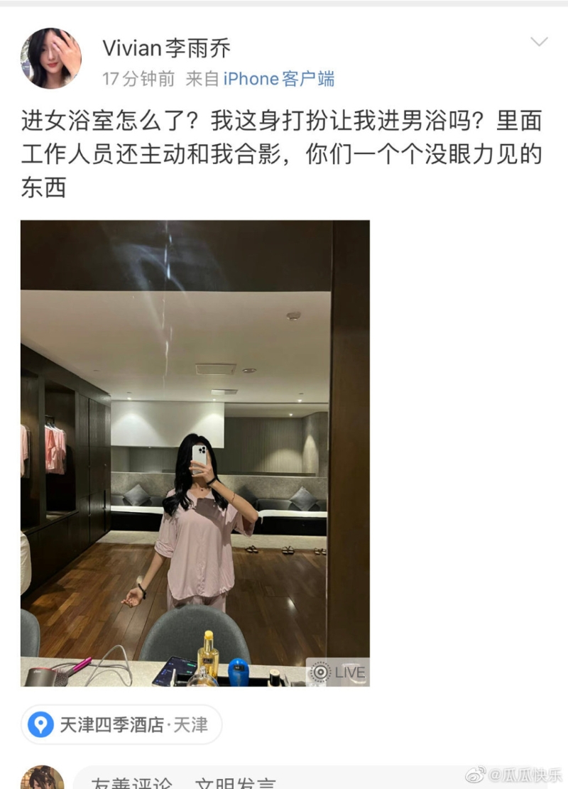 ▲网红男扮女装入女浴室拍照放上网。 微博图
