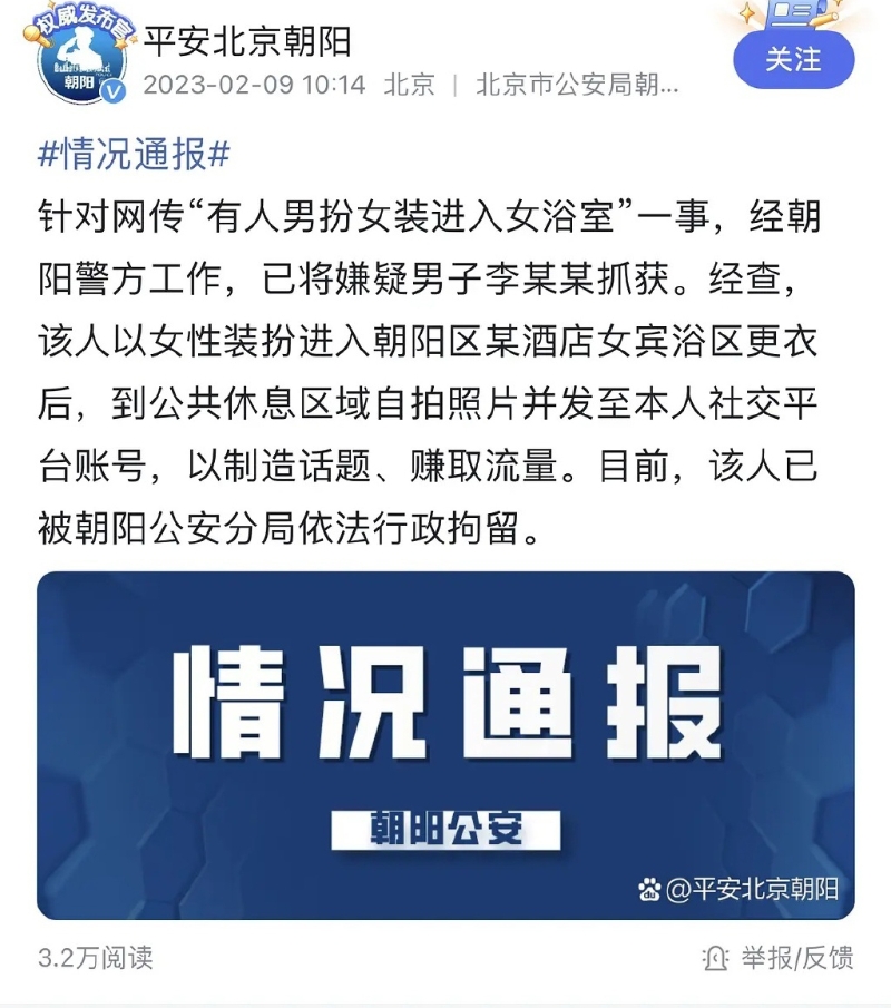 北京市公安局朝阳分局今日(9日)透过其官方微博(@平安北京朝阳)发布《情况通报》,指针对网传“有人男扮女装进入女浴室”一事,朝阳警方经调查后,已将涉案男子李某某拘捕。 局方指,经查,该人以女性装扮进入朝阳区某酒店女宾浴区更衣后,到公共休息区域自拍照片并发至本人社交平台账号,以制造话题、赚取流量。 目前,涉案男子已被朝阳公安分局依法行政拘留。