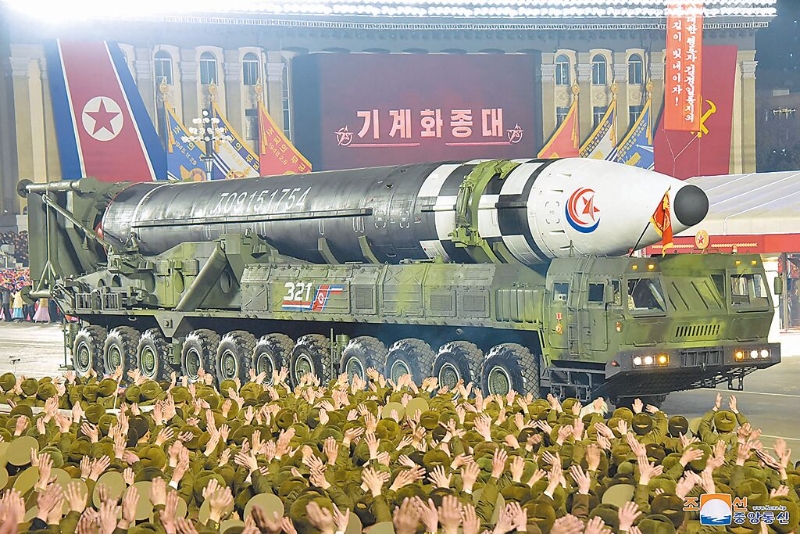 美国太空技术公司马萨尔科技(Maxar Technologies)发布周三晚10时05分许用卫星拍摄的金日成广场图片,可见多辆载有洲际导弹的移动式发射车(TEL)在群众面前列队行驶而过。图片中,“火星-17”型洲际弹道导弹领队,搭载中远程导弹的发射车排成两路纵队跟随在其后,下一个一路纵队为型号不明的导弹。鉴于朝鲜一般在阅兵上将威力强大的武器或新型武器安排在后尾亮相,该导弹可能是朝鲜日前试射的配备固体燃料引擎的新型导弹。