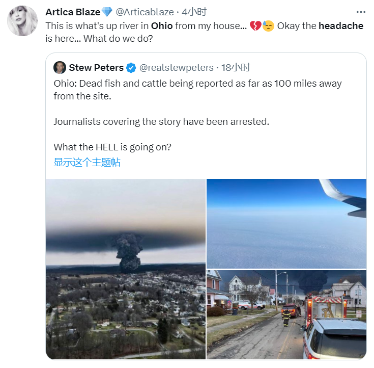 而据《环球时报》报道,还有网友联想到近来被美国媒体、官员热炒的“间谍气球”一事,12日前后提出质疑:“所有这些‘飞行物’都是为了分散你们的注意力,(让你们把注意力)从政府决定在俄亥俄州农田上燃烧的大量致命氯乙烯上转移走。”“在俄亥俄州发生这种事时,为什么‘间谍气球’还会在任何时间段出现在电视上。氯乙烯蔓延了好几英里。这是一场巨大的环境灾难。氯乙烯是一种公认的致癌物,而且显然是警察帮忙炸毁了这列脱轨的火车?”