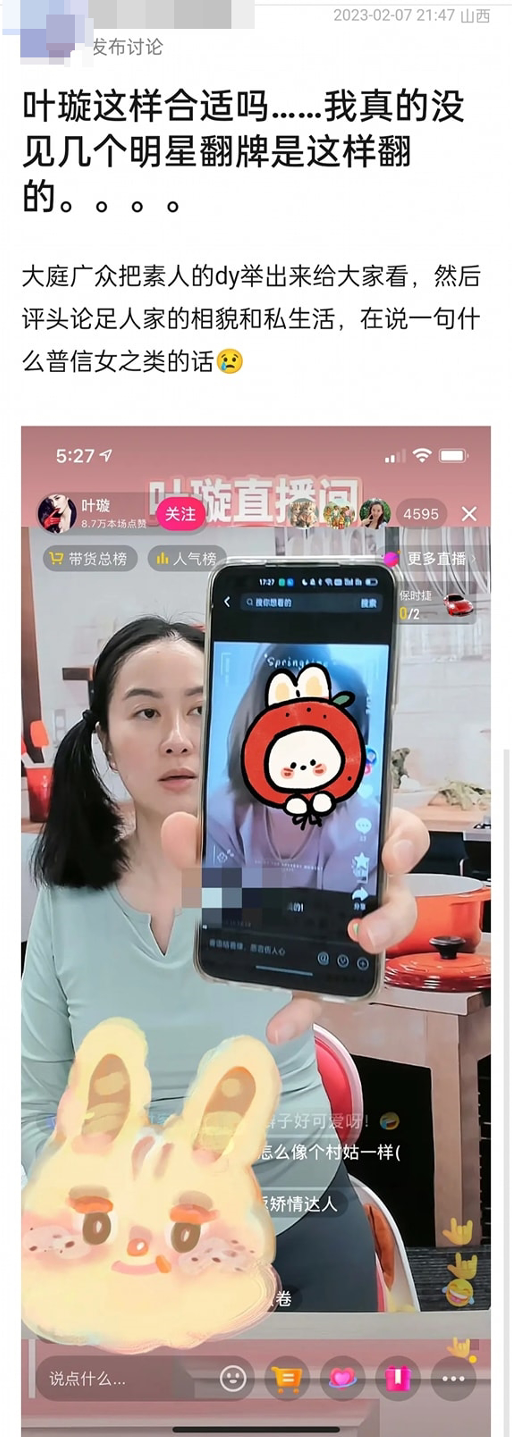 近日有网友在论坛上发贴文讨论叶璇开直播,称叶璇直播中公布素人抖音账号,并且针对对方发表相貌、私生活等的评论,认为叶璇身为公众人物行为不当,可以看到叶璇的确举着手机展示素人抖音主页,不少网友惊呼:“属于引导网暴了吧这是”、“我下午看她翻了好几个牌,还有一个她好像看人家是单亲妈妈,还把人家孩子照片举出来给大家看”,也有人为叶璇反驳“是不是又想带节奏,黑叶璇姐”。