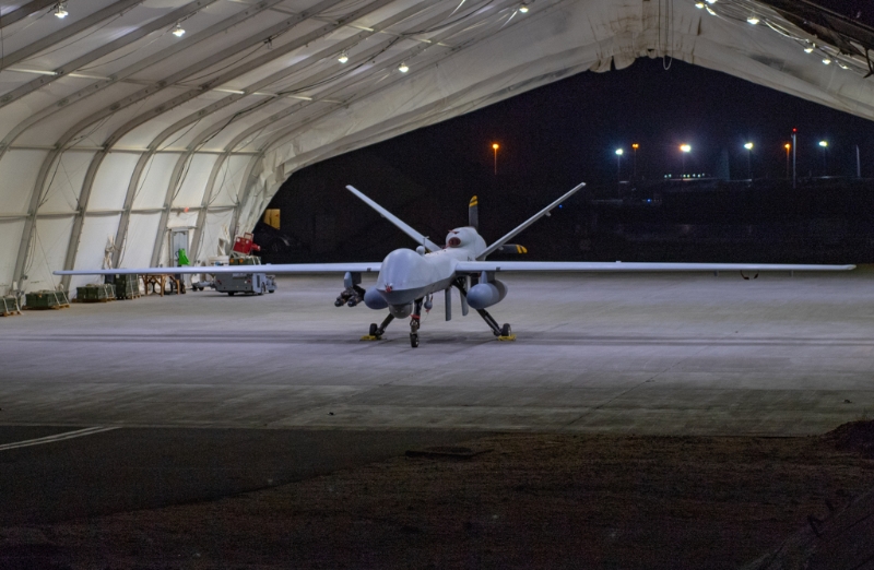 ▲2019年7月23日,科威特阿里萨勒姆空军基地进行侦搜行动之前,一架配备外部油箱和弹药的美国空军MQ-9 死神无人机停在机库中。DVIDS