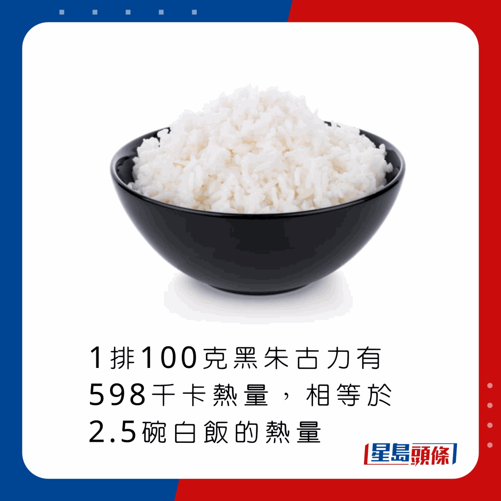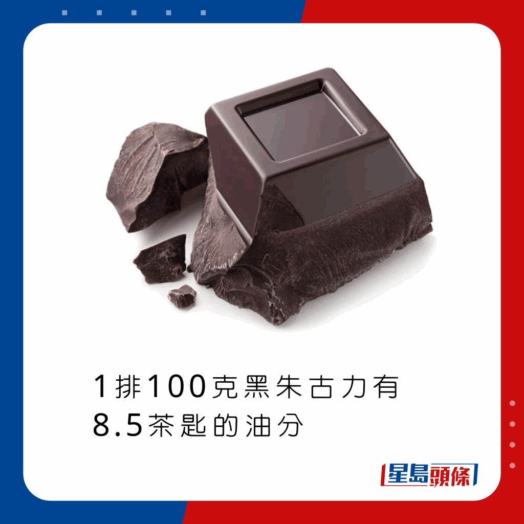 1排重100克的黑朱古力已有598千卡热量,相等于2.5碗白饭的热量,当中有8.5茶匙的油分,每天进食1排朱古力的话6天就会增加1磅体脂了,体重及体脂增会亦会增加患上各种慢食疾病的风险。
