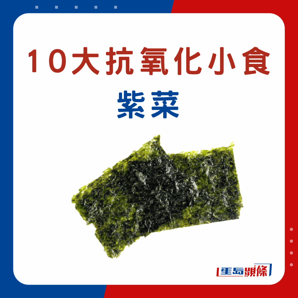 紫菜含丰富的多酚、类黄酮包括儿茶素、花青素、单宁及胡萝卜素,有抗氧化之功效,同时亦含有蛋白质及纤维等营养素。